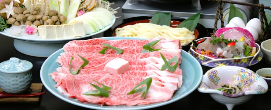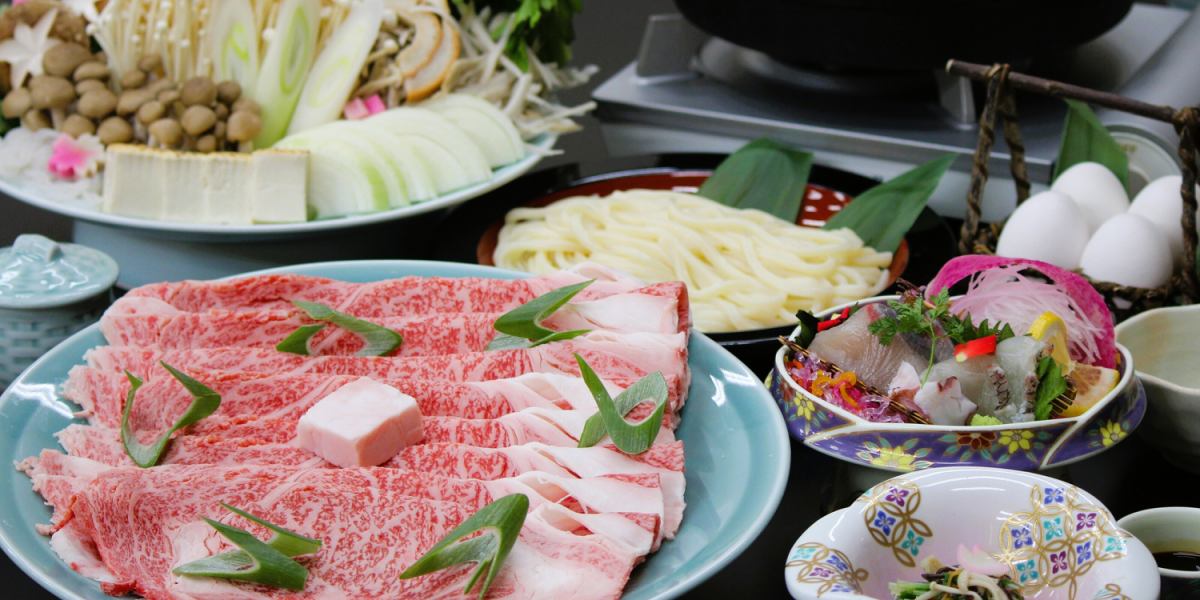 寿喜烧火锅套餐 | 梅子酒 / 时令开胃菜 / 什锦刺身(三种) / 鸟取和牛寿喜烧 / 蒸蛋羹 / 乌冬面(餐后甜点) / 时令水果 |